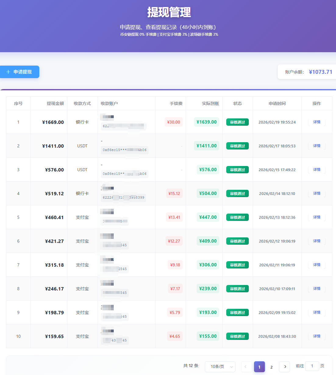 提现灵活:满10元即可提现,支付宝、银行卡,币安,实时到账。
